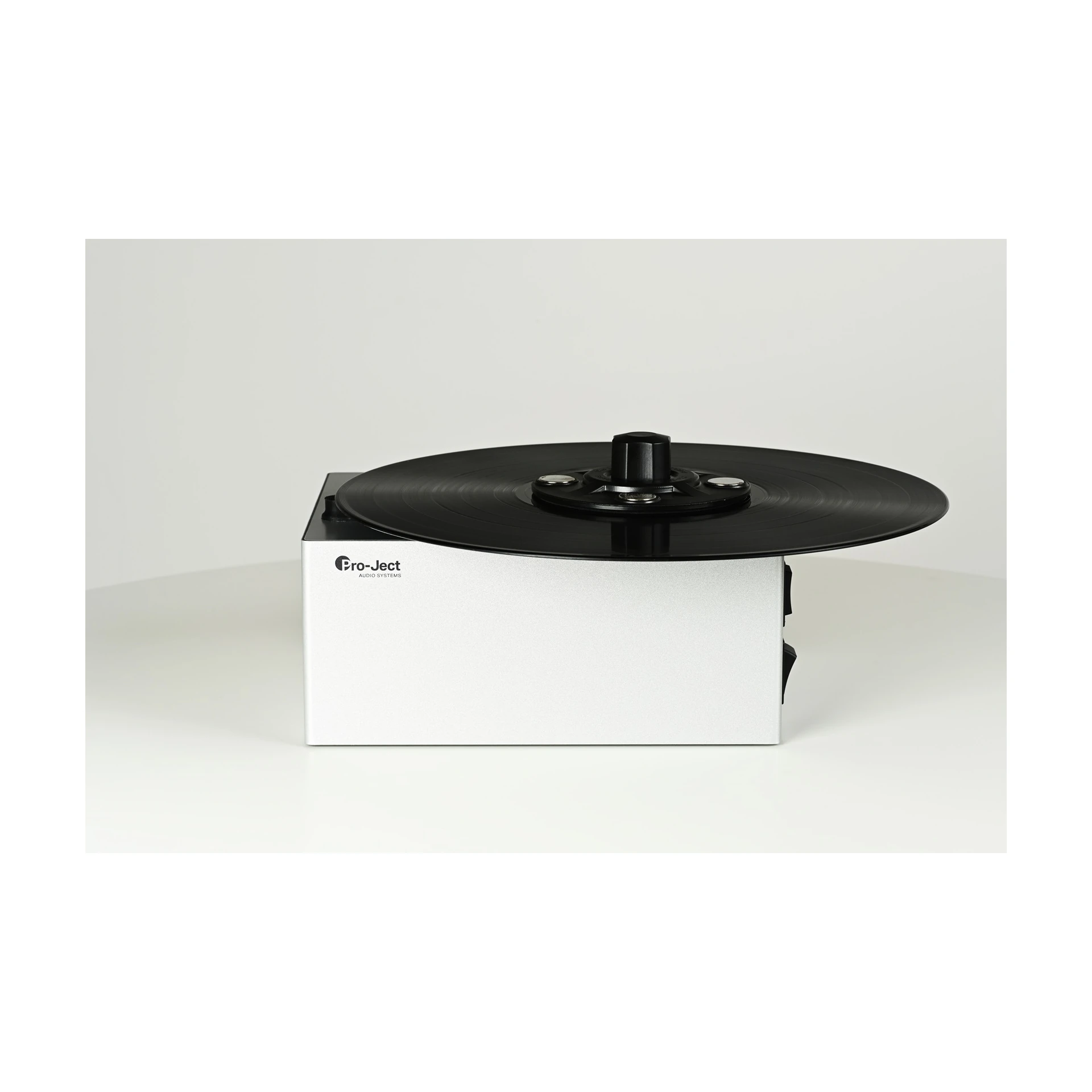 Eine magnetische Schallplattenklemme ermöglicht das schnelle und sichere Einspannen von Schallplatten. Die Klemme versiegelt den Labelbereich und schützt ihn so vor der Reinigungsflüssigkeit.