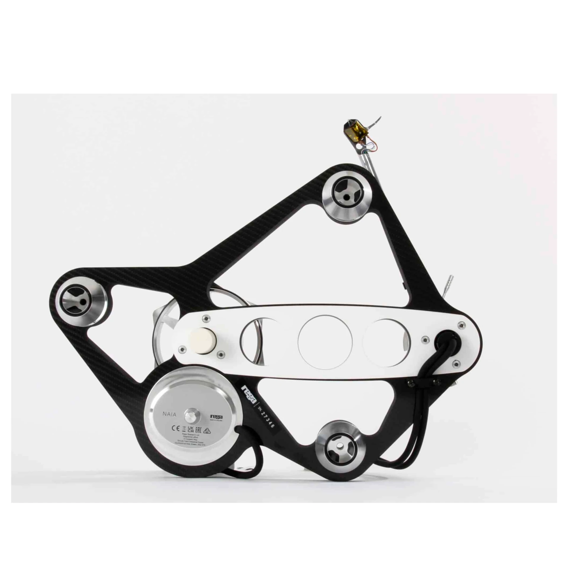 Der Naia bringt unsere bahnbrechende Sockeltechnologie mit geringer Masse und hoher Steifigkeit auf die nächste Stufe, indem er einen mit Graphen imprägnierten Kohlefaser-Skelettsockel mit Tancast 8-Schaumkern verwendet. Diese extrem steife Struktur wird dann durch zwei keramische Aluminiumoxidstreben weiter verstärkt, das gleiche Material, das auch für die neu gestaltete, resonanzgesteuerte Keramikplatte mit verbessertem Schwungradeffekt und komplexem Profil verwendet wurde.