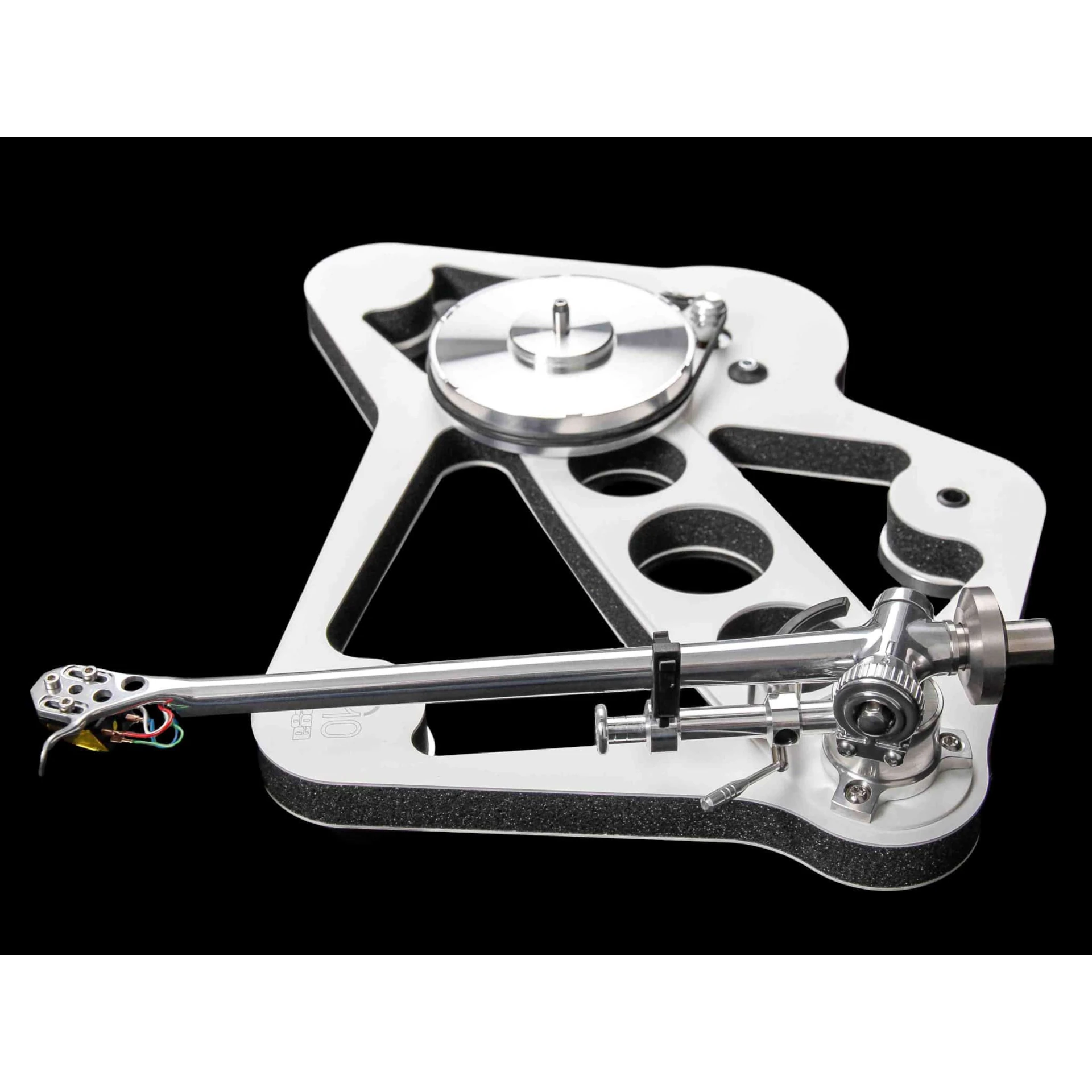 1EDouble Brace 1C Technik: Masse nimmt Energie auf 13 abgezogene Energie bedeutet Verlust an musikalischer Information. Das extrem leichte Chassis in Verbindung mit einer keramischen oberen und einer unteren Verstärkung aus Phenolharz zwischen Arm und Tellerlager bilden ein festes vorgespanntes System genau an der Stelle, wo höchste Festigkeit erwünscht ist. Diese Konstruktion verhindert Energieaufnahme, unterbindet unerwünschte Resonanzen und vermeidet so unnatürliche Verzerrungen. Ebenso kann höhere Masse die Weiterleitung unerwünschter Vibrationen wie Motoren- oder Lagergeräusche in den Plattenteller begünstigen. Die gewählte Verstärkung erhöht die Festigkeit der Struktur an den Stellen, wo sie gebraucht wird und vermindertes Gesamtgewicht des Chassis geht direkt das Problem der Energieaufnahme und unerwünschten Energieleitung an. Tonarm und Abtaster werden so in die Lage versetzt, die Information der Tonrille exakt aufzunehmen.