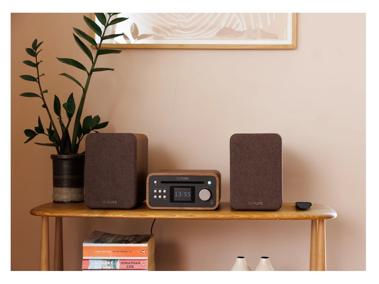 Erhältlich in Baumwollweiß/Eiche, Kaffeebraun/Walnuss oder Schwarz fügt sich diese Stereoanlage harmonisch in jedes Zimmer ein. Kompakt und dennoch elegant, passt sie perfekt auf ein Bücherregal oder eine Kommode.